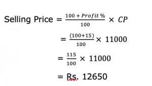 - A computer purchased for Rs. 11000 is sold at a profit of 15%. Calculate the selling price.