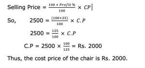 - A chair is sold for Rs. 2500 at a profit of 25%. Calculate its cost price.