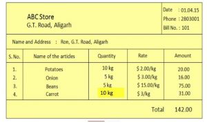 Ron purchased some vegetables from ABC Store, G.t. Road, Aligarh. The bill given by store is shown below: