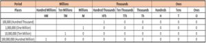 - The third period is millions consisting of three places i.e. millions, ten-millions and hundred million and then billions, trillions and so on.